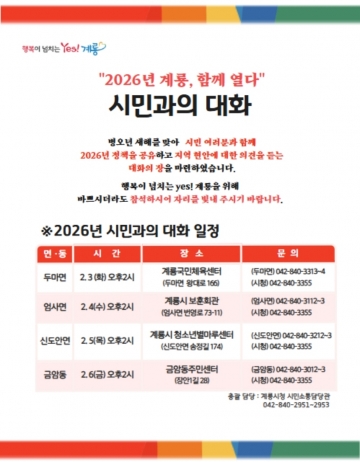 [충청와이드뉴스]계룡시가 3일부터 6일까지 면,동 26년 시민과의 대화를 개최하고 지역에 현안과 성과를 보고하는 자리를 만들었다.