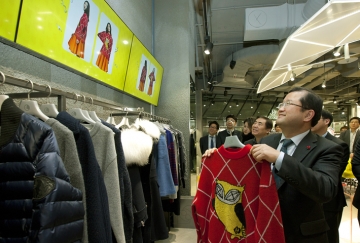 최재유 미래창조과학부 제2차관이 15일 오전 서울 강남구 코엑스몰 의류매장에서 김인선 SQI소프트 미디어사업팀 대리로부터 사물인터넷을 활용한 '스마트 행거' 에 대한 설명을 듣고 상품들을 비교해 보고 있다.