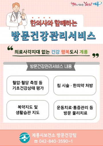 ‘한의사와 함께하는 방문건강관리서비스’ 관련 문의는 계룡시보건소 방문건강팀(☎042-840-3590~1)으로 하면 된다.