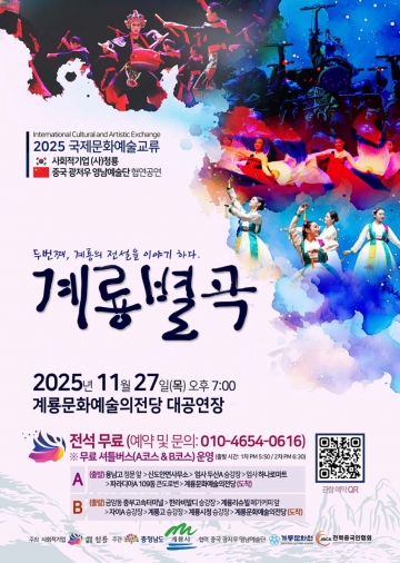 [충청와이드뉴스]충남 계룡시 사회적기업(사)청룡(대표 신혜경)은 27일 오후 7시 계룡예술의전당 대공연장에서 중국 광저우예술단(단원 25명)과 청룡 단원 전문국악인( 20여 명)이 함께하는 계룡별곡이라는 주제로 공연을 진행한다.